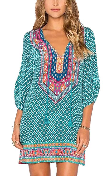 Women Bohemian Neck Tie Vintage Printed Ethnic Style Summer Shift Dress91.5% polyester & 8.5% Sp.....