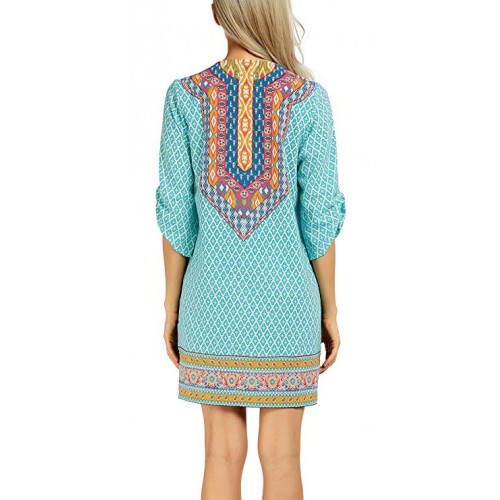 Women Bohemian Neck Tie Vintage Printed Ethnic Style Summer Shift Dress